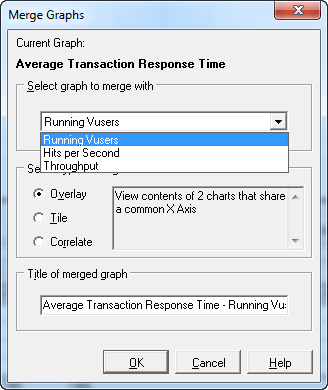 Here, we’re merging Transaction Response Time with Running VUsers graph. The Merge Graph window requires you to provide the name of newly formed merged graph.