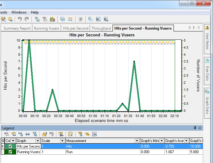 This graph displays the number of hits made on the Web server by VUsers during each second of the load test. This graph helps you evaluate the amount of load VUsers generate, in terms of the number of hits.