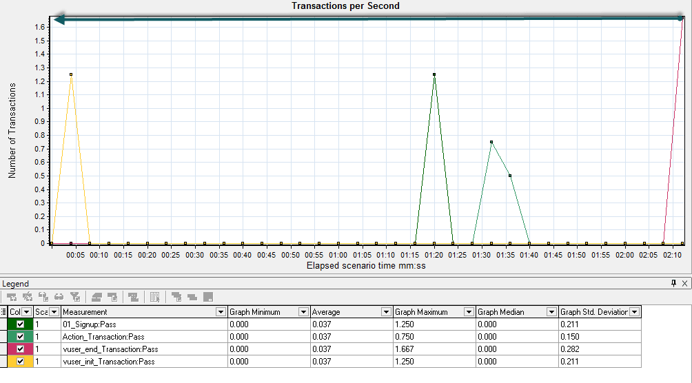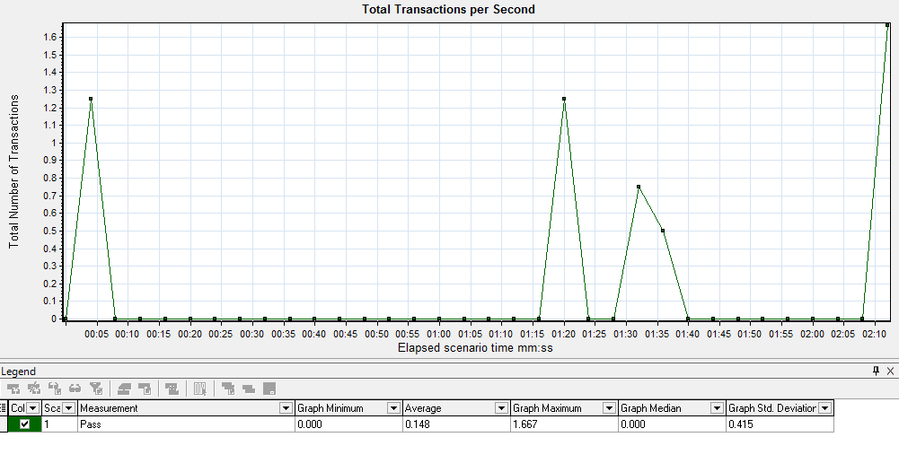 This graph displays the total number of completed transactions (both successful and unsuccessful) performed during each second of a load test. This graph helps you determine the actual transaction load on your system at any given moment. This is how it looks like: