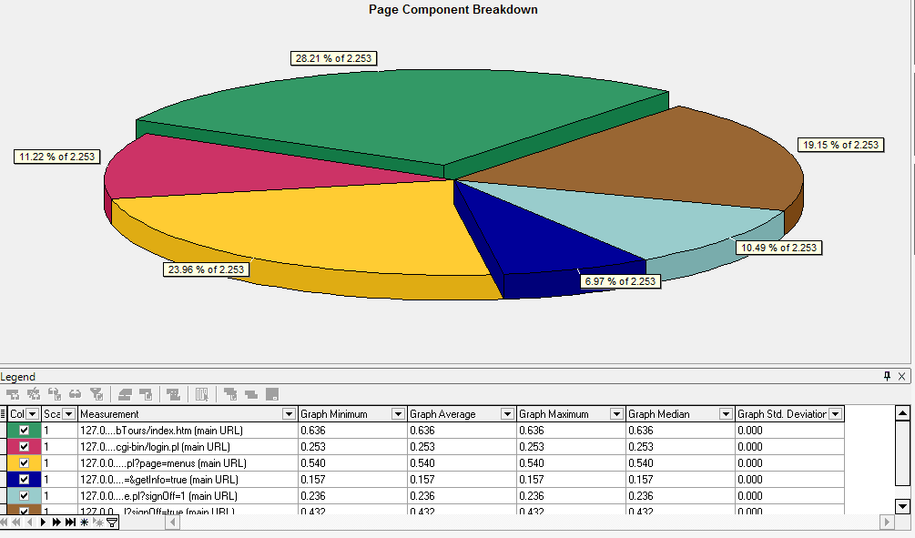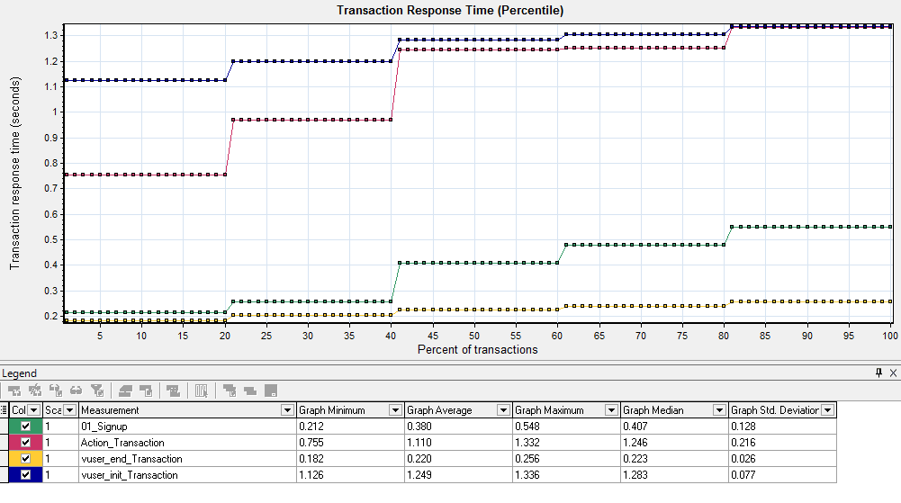The Legend shows the transaction name, its color, minimum value, average value, maximum value and standard deviation (variance around the mean).