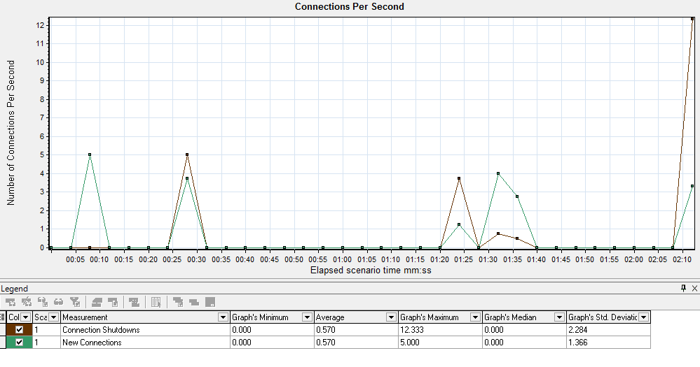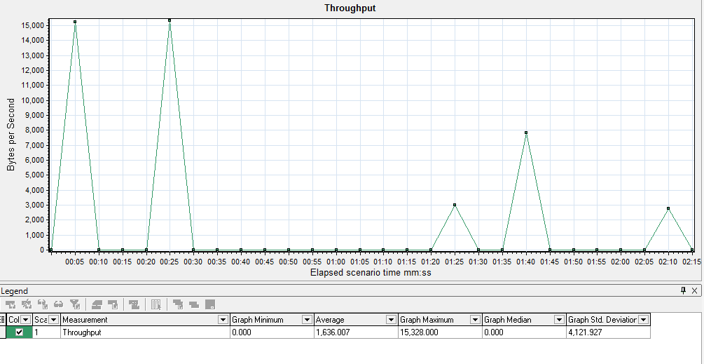 This graph displays the amount of throughput (in bytes) on the Web server during the load test. Throughput represents the amount of data that the VUsers received from the server at any given second. This graph helps you to evaluate the amount of load VUsers generate, in terms of server throughput.