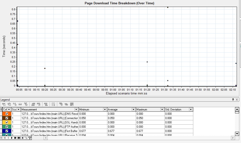 This graph displays the average response time (in seconds) for each Web page and its components during each second of the scenario run. This is how it looks like: