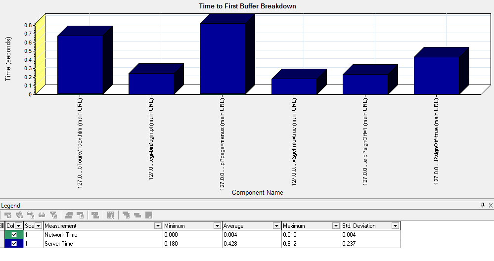 This graph displays each Web page component's relative server/network time (in seconds) during each second of the scenario run, for the period of time until the first buffer is successfully received back from the Web server. This is how it looks like:
