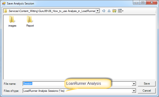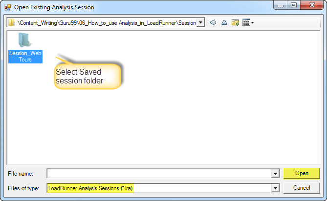 You can open an existing session in similar way. Simply click Open under File Menu and select the folder of saved session. Remember, HP Analysis will not open the last folder node; rather it will open the folder itself.