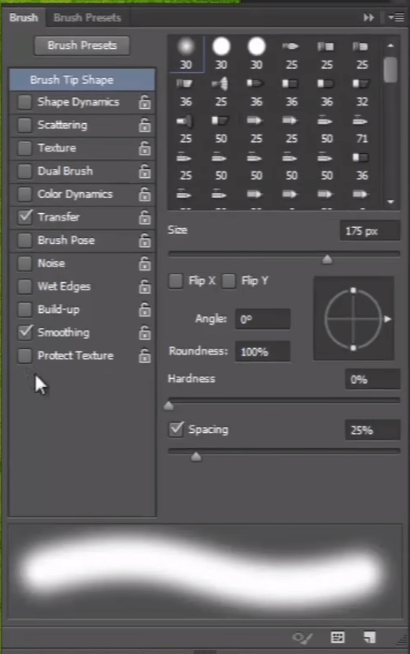 In this panel at the top of the list of options in “Brush tip shape”, we have same options as we have seen before in “brush preset picker” such like “size” , “angle” , “Roundness” , “Hardness” and “spacing”.