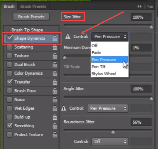 You can also choose different controls such like “fade” , “pen pressure” , “pen tilt” and “stylus wheel”.