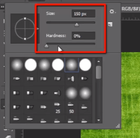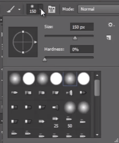 To talk about editing the brush, I’m choosing a soft edge brush here, and you can see right above it “size” and “hardness”. You can set the size of your brush and hardness determines the hardness and softness of your brush edge.