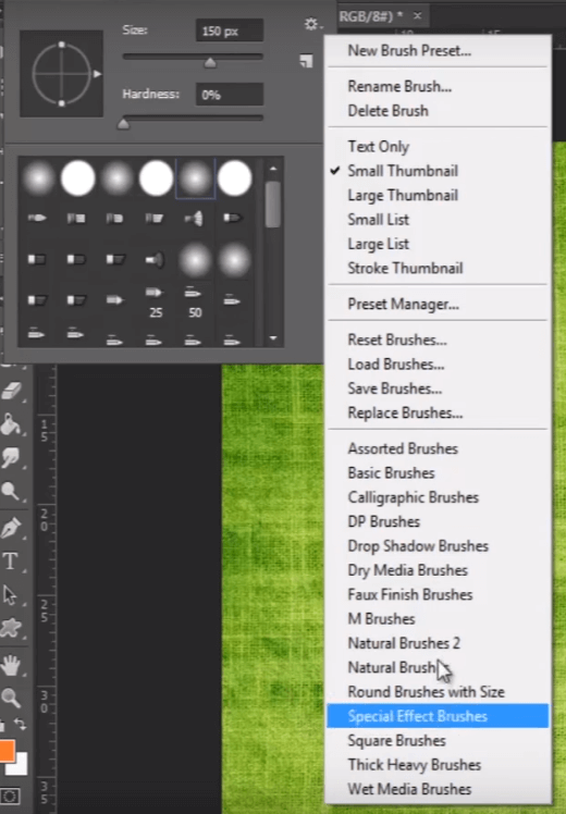 Now click on this small wheel icon. you will get here some list of different group of preset brushes. These brushes are inbuilt with Photoshop.