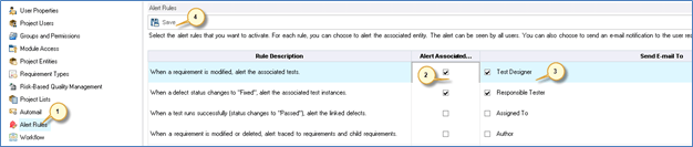 This module enables project admins to activate alert rules for the current project. This feature will create alerts and send emails when changes occur in the project. This module holds good for requirements, associated tests , defects.