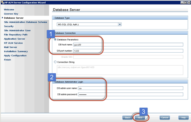 Step 2) Enter the Server Details. You should have preinstalled oracle/MS SQL Server. Select the appropriate database credentials and click 'Next'.