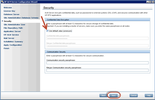 Step 4) The Security page in the server configuration wizard opens. You can check 'Use Default Value' and click 'Next'.