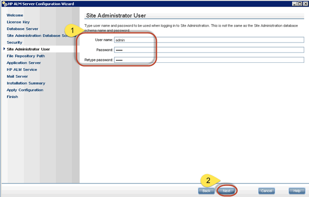 Step 5) Enter 'Site Administrator' User ID and Password. DONOT forget these credentials as these details would be required to login to ALM successfully.