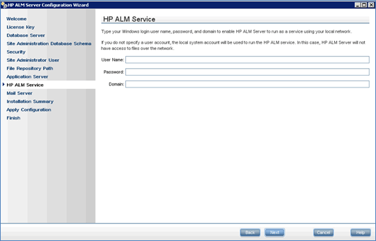 Step 8) Leave the HP ALM Service as empty as your Windows login credentials would be used by default. Click 'Next' to continue.