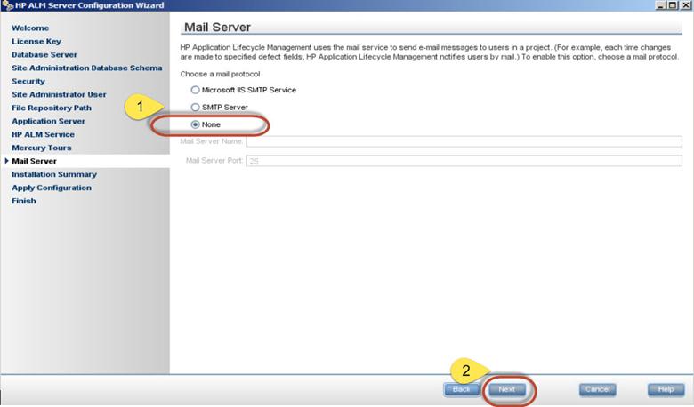 Step 9) Enter the server details to setup mail server for HP ALM. This is used to send emails using ALM. If you do not want to specify, click none and move ahead