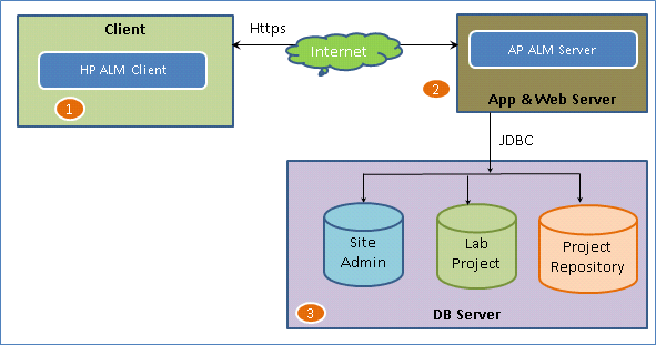 Now let us understand the technology part of HP-ALM. ALM is an enterprise application developed using Java 2 Enterprise Edition (J2EE) that can have MS SQL Server or Oracle as its back end. ALM has 3 components – Client, Application Server and Database Server.