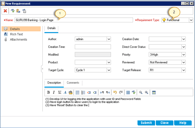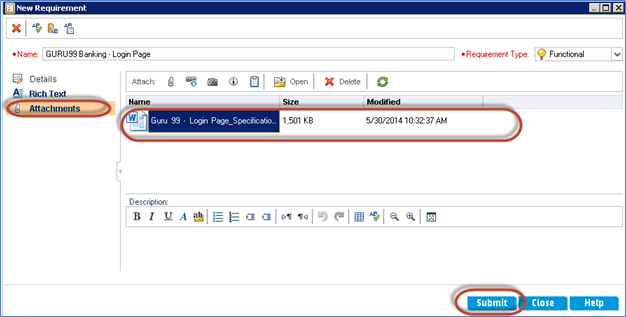 Step 10) Usually, requirements are captured in a word document. They be uploaded under attachments tab as shown below. ALM also support all other file types like .xls, .jpg etc. After uploading click Submit button.