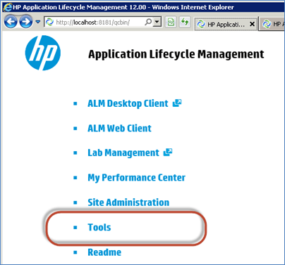Step 1) Navigate to ALM home page http://localhost:8181/qcbin and click on "Tools" from the list of links.