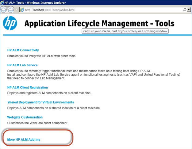 Step 2: Click on "More HP ALM Add-ins" Link from the add-ins page as shown below.