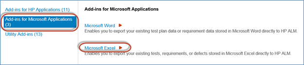 Step 3) Select 'Add-ins for Microsoft Applications' and select 'Microsoft Excel' from the link as we would be using MS Excel add-in to upload the Data into HP-ALM.