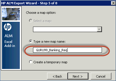 Step 5) Enter the New Map name. The first option, 'Select a map' is disabled because we haven't created a map so far. Hence we should create new map name and click 'Next'. We haven't selected 'Create a Temporary map' as we would like to reuse every time for uploading 'Requirements'.