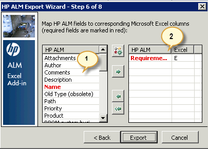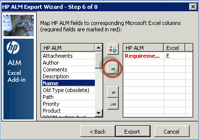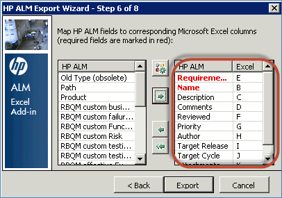 Enter the column name in Excel that corresponds to the appropriate column name in HP ALM.