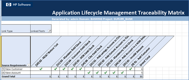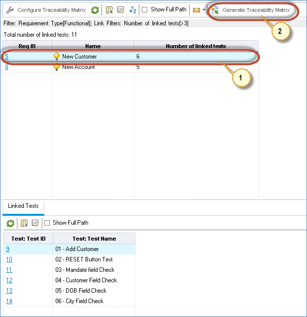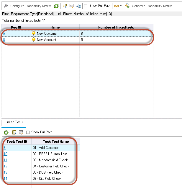 Step 7) Following screen is displayed to the user with all the requirements and its corresponding tests if the specified traceability matrix criteria is met.
