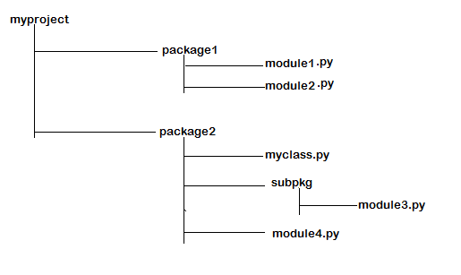 The folder package2 has one class myclass.py, a sub-package subpkg with module3.py, and last module4.py.
