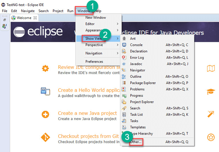 Step 9) After the restart, verify if TestNG was indeed successfully installed. Click Window > Show View > Other.