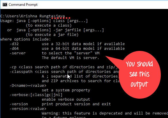 Once installation is complete, open command prompt and type “java”. If you see the following screen you are good to move to the next step