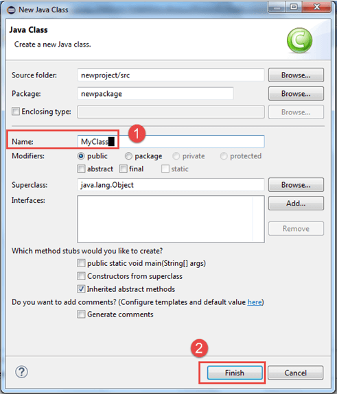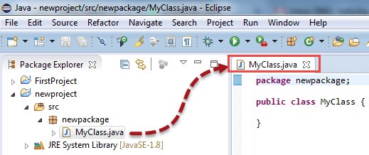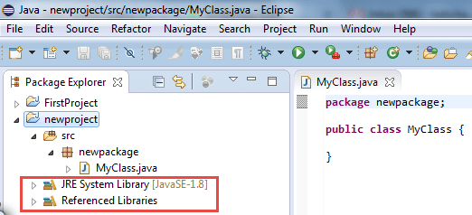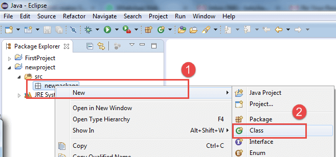 5. Create a new Java class under newpackage by right-clicking on it and then selecting- New > Class, and then name it as "MyClass". Your Eclipse IDE should look like the image below.