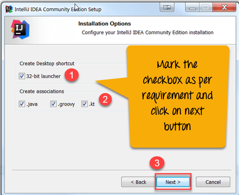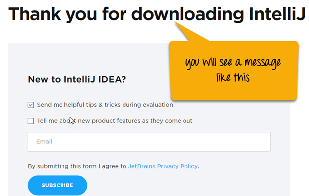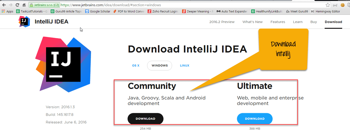 Step 1) To download IntelliJ visit the jetbrains site. Here we have selected "Community" Version. You can select "ultimate" version for mobile, web and enterprise development.