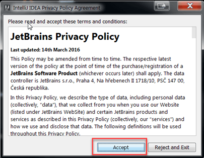 Step 10) When you click on 'ok' button in the previous step, it will ask for Jetbrain privacy policy agreement. Click on 'Accept' button.