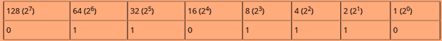In the table above, you can see that the bits with the value 64, 32, 8, 4 and 2 are turned on and represented as binary 1. So for the binary values in the table 01101110, we add the numbers