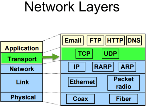 The main protocols of the Transport layer are User Datagram Protocol (UDP) and the Transmission Control Protocol (TCP).