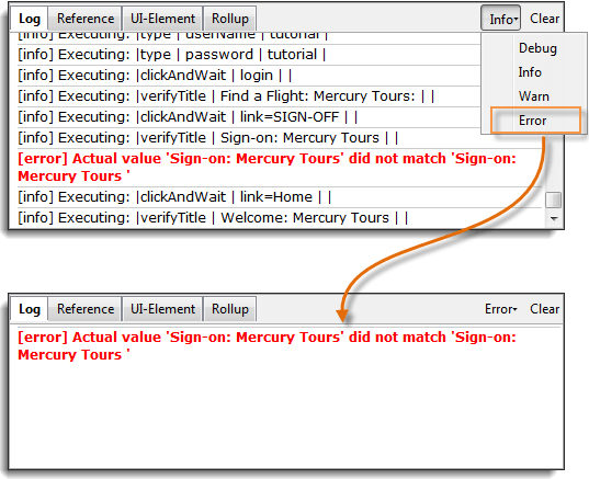 Logs can be filtered by type. For example, if you choose to select the "Error" option from the dropdown list, the Log Pane will show error messages only.