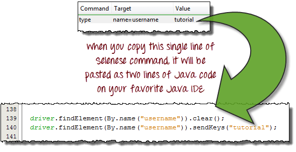 For example, when you choose Java/JUnit 4/WebDriver as your clipboard format, every Selenese command you copy from Selenium IDE's editor will be pasted as Java code. See the illustration below.
