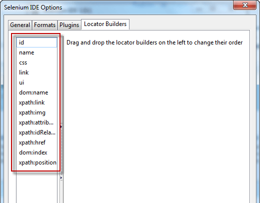 - Locator builders. This is where you specify the order by which locators are generated while recording. Locators are ways to tell Selenium IDE which UI element should a Selenese command act upon. In the setup below, when you click on an element with an ID attribute, that element's ID will be used as the locator since "id" is the first one in the list. If that element does not have an ID attribute, Selenium will next look for the "name" attribute since it is second in the list. The list goes on and on until an appropriate one is found.