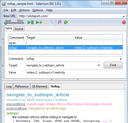 - The UI-Element and Rollup tabs are for advanced Selenium IDE users only. They both require considerable effort in coding JavaScript.