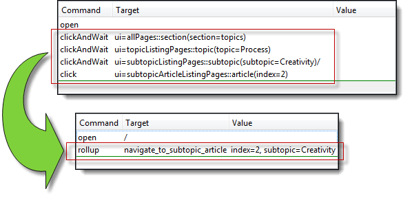 Rollups are reusable; meaning, they can be used multiple times within the test case. Since rollups are groups of commands condensed into one, they contribute a lot in shortening your test script.