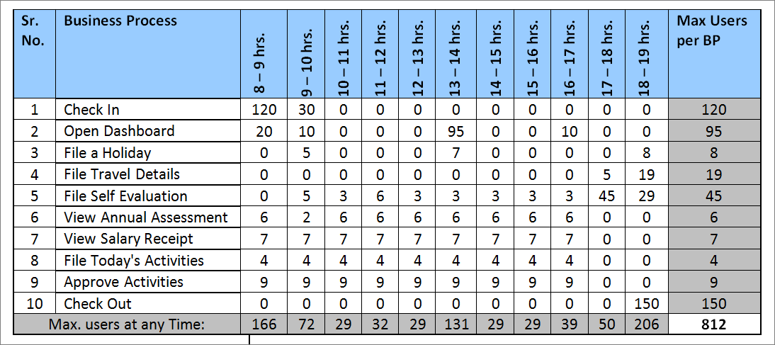 A requirements metric can be prepared to elicit user load on the system. Below is an example of an attendance system in a company: