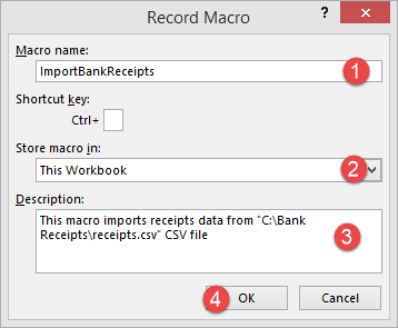 Before we save our work book, we will need to delete the imported data. We will do this to create a template that we will be copying every time we have new receipts and want to run the ImportBankReceipts macro.