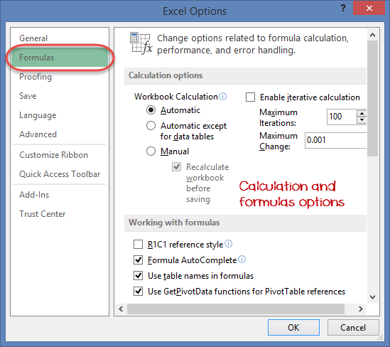 This option allows you to define how Excel behaves when you are working with formulas. You can use it to set options i.e. autocomplete when entering formulas, change the cell referencing style and use numbers for both columns and rows and other options.