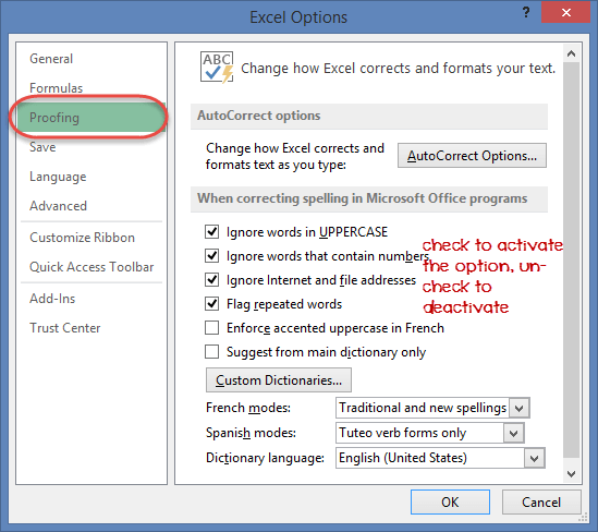 This option manipulates the entered text entered into excel. It allows setting options such as the dictionary language that should be used when checking for wrong spellings, suggestions from the dictionary, etc. You can this option from the options dialogue window under the proofing tab from the left-hand side panel