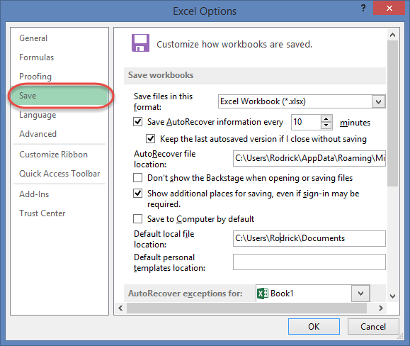 This option allows you to define the default file format when saving files, enable auto recovery in case your computer goes off before you could save your work, etc. You can use this option from the Options dialogue window under save tab from the left-hand side panel