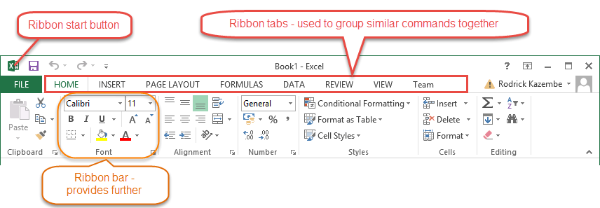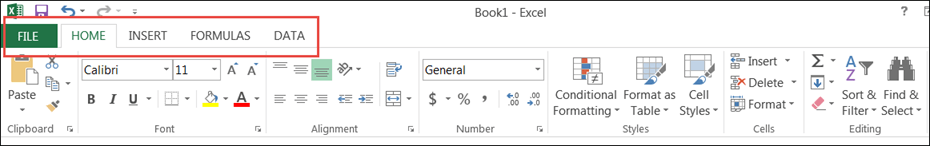 Ribbon tabs – the tabs are used to group similar commands together. The home tab is used for basic commands such as formatting the data to make it more presentable, sorting and finding specific data within the spreadsheet.