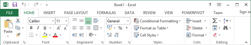 The ribbon provides shortcuts to commands in Excel. A command is an action that the user performs. An example of a command is creating a new document, printing a documenting, etc. The image below shows the ribbon used in Excel 2013.