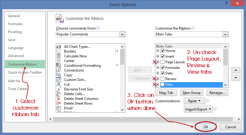 The above image shows the default ribbon in Excel 2013. Let's start with customization the ribbon, suppose you do not wish to see some of the tabs on the ribbon, or you would like to add some tabs that are missing such as the developer tab. You can use the options window to achieve this.
