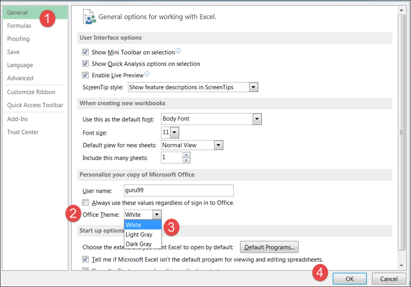 To set the color-theme for your Excel sheet you have to go to Excel ribbon, and click on à File àOption command. It will open a window where you have to follow the following steps.
