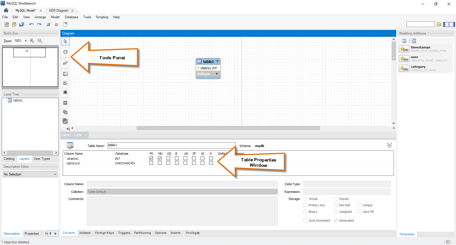 The figure shown below shows the modeling window for MySQLWorkbench.