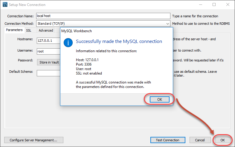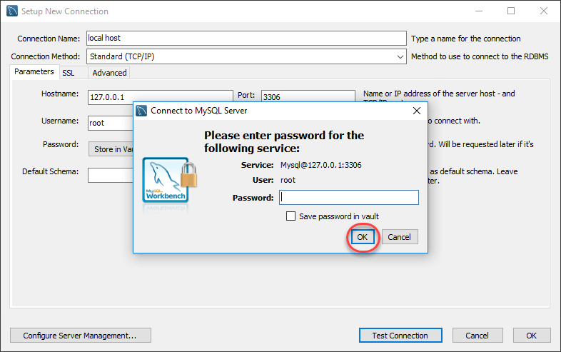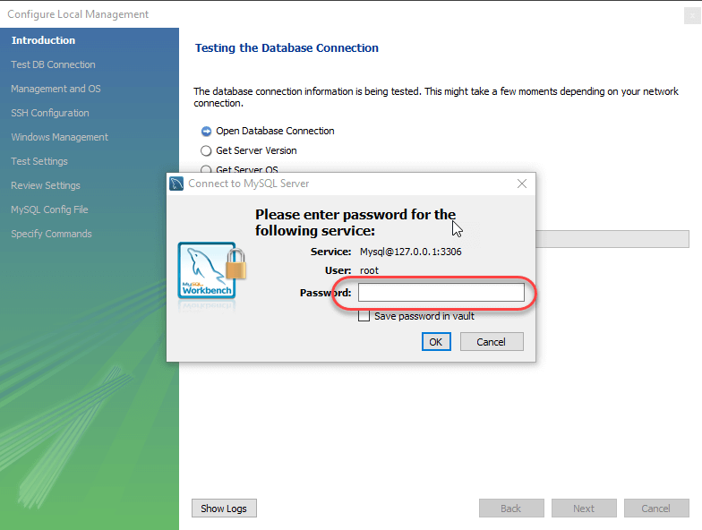 5. Next the Wizard will test connections to database. If test fails, go back and correct database connection parameters.5. Next it will open a pop up window asking your root password to test your connection with the local mysql server instance. The password is the one you set during installation of MySQL Workbench. Enter your password and press OK
